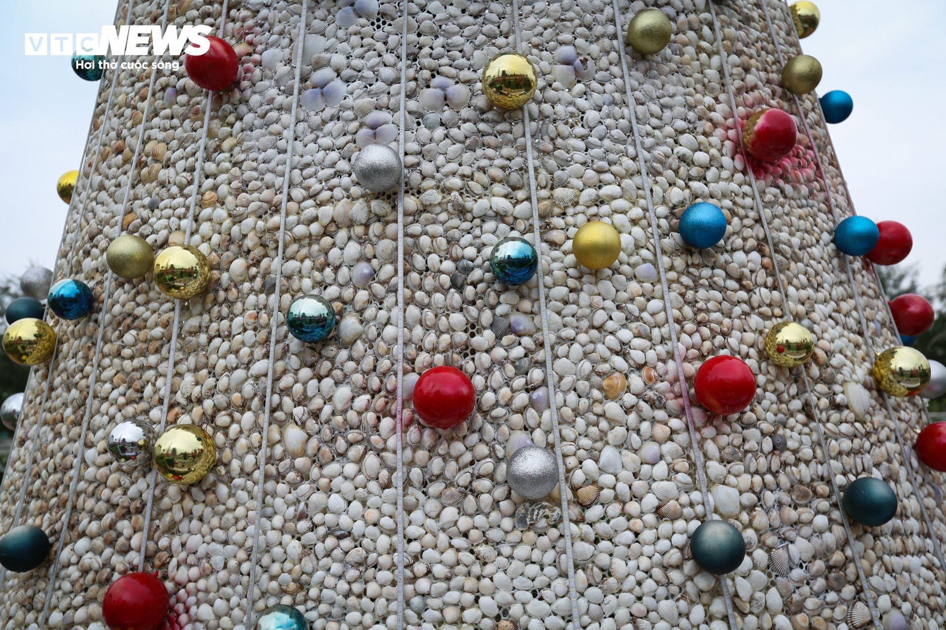 “Trong lúc dọn dẹp bãi biển, nhận thấy có nhiều vỏ sò nên chúng tôi lên ý tưởng làm cây thông Noel bằng cách kết dính từng chiếc vỏ lại với nhau. Cây thông có chiều cao 8m, đường kính đáy rộng 3,2m. Xung quanh được trang trí lung linh bằng hằng trăm bóng đèn, bóng nháy”, anh Truyền nói.