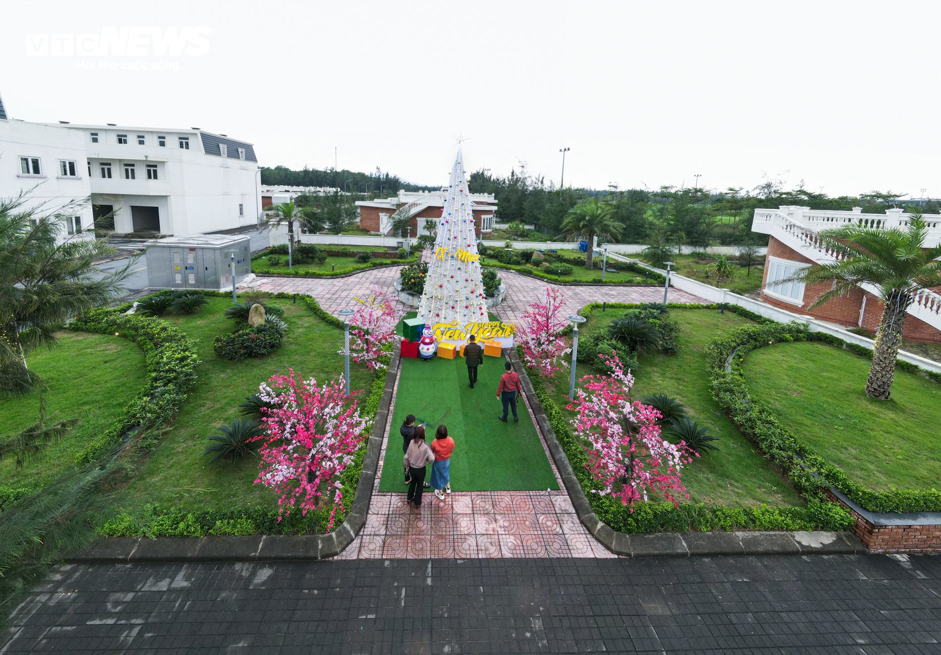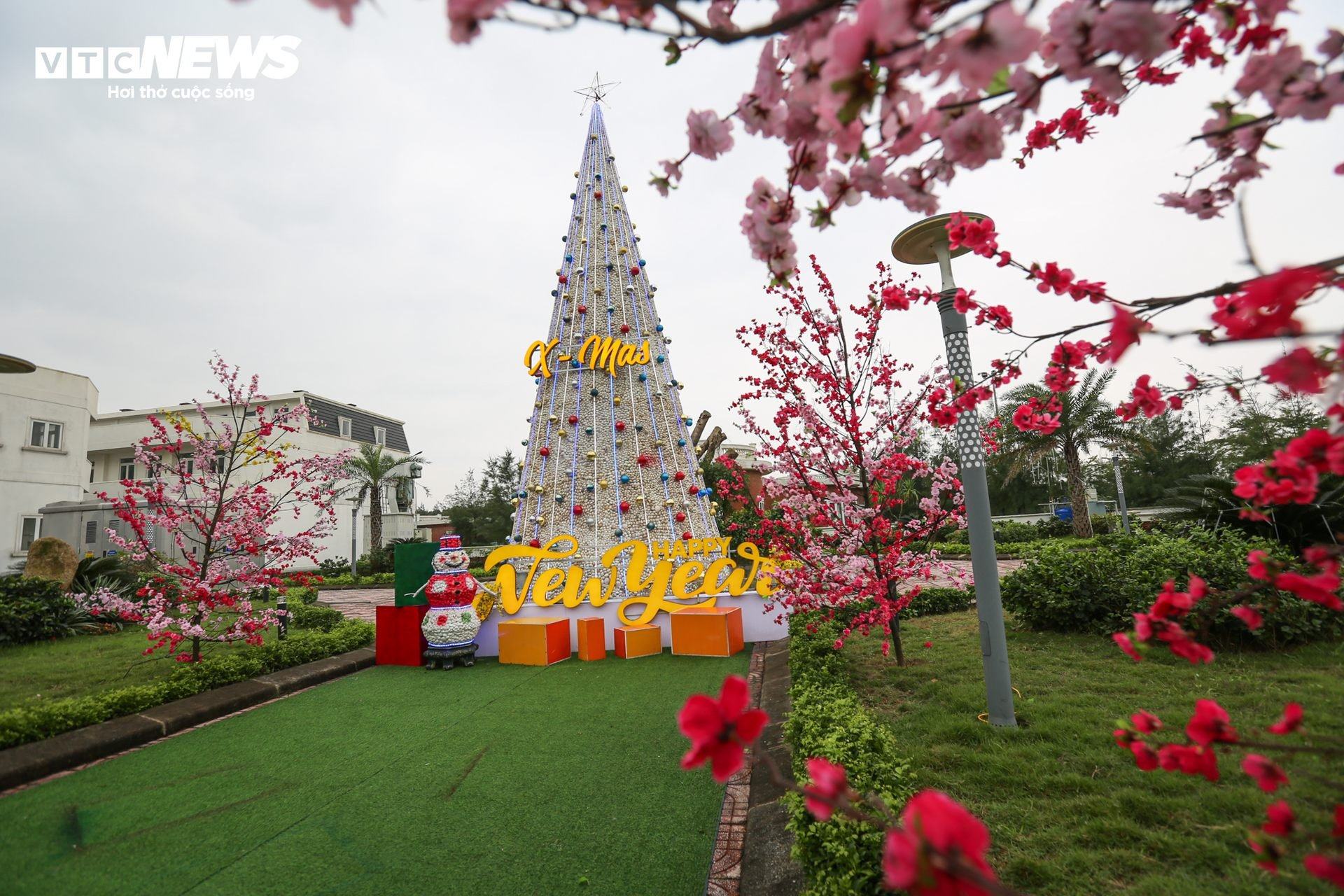 Xung quanh cây thông là 4 cây đào giả được đặt đối xứng nhau tô thêm sự ấm áp trong mùa Giáng sinh.